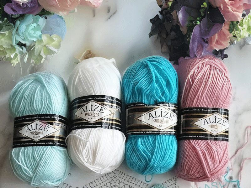 Việc chọn màu hoàn toàn linh hoạt – bạn có thể dùng 1 màu, 2 màu, 3 màu hoặc như trong mẫu minh họa là phối 4 màu len khác nhau. Trong mẫu này, mình dùng len Alize Superlana Classic, gồm 4 màu:
